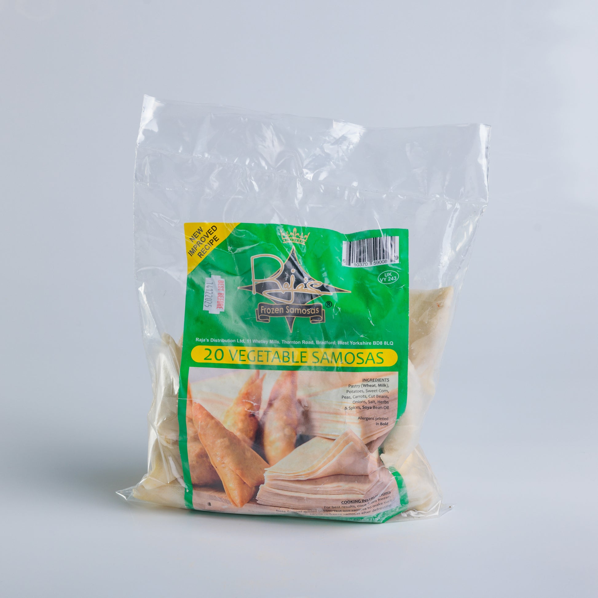 Each pack contains 20 frozen vegetable samosas.